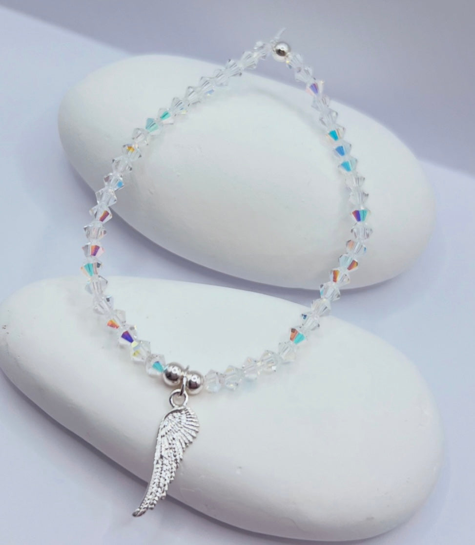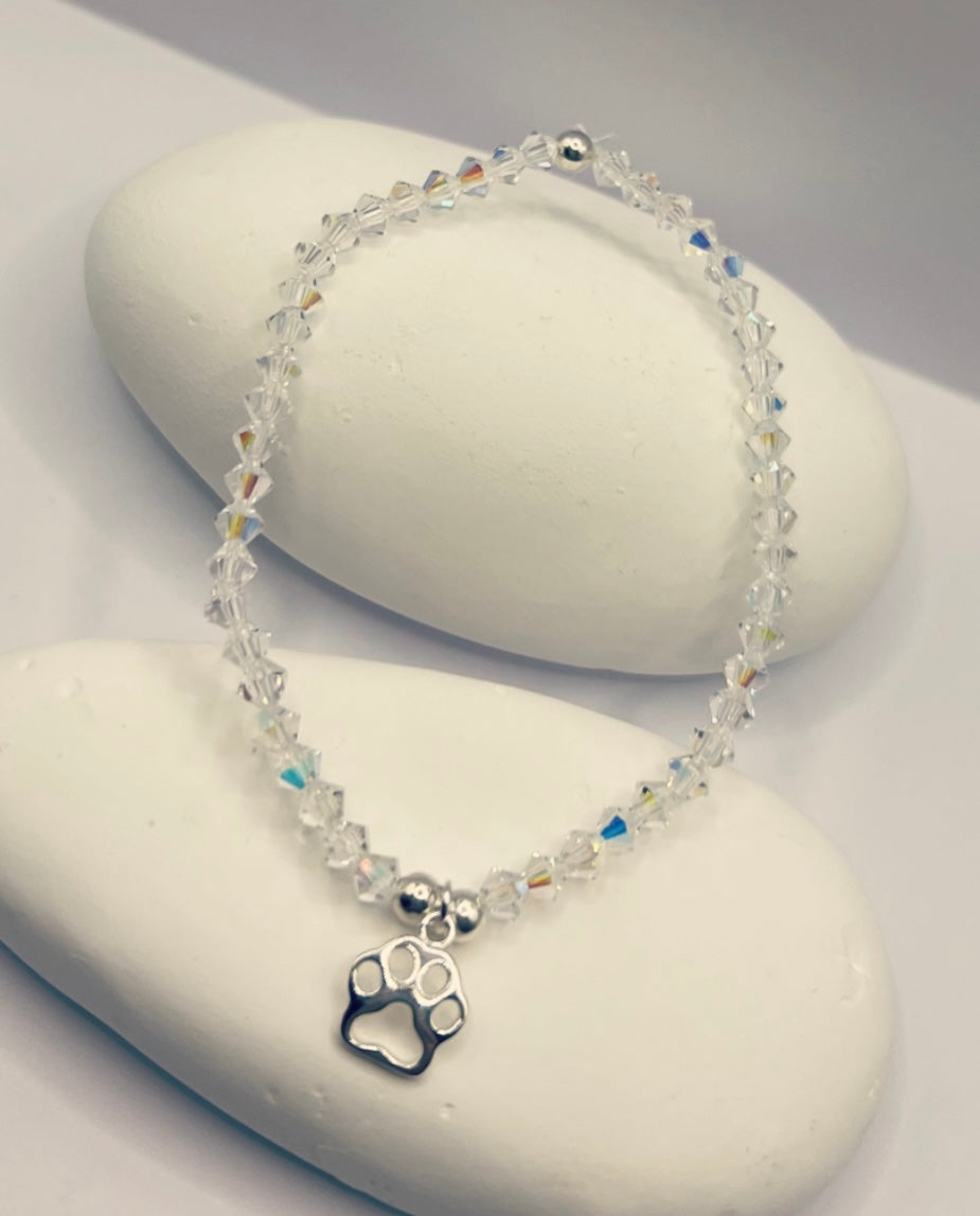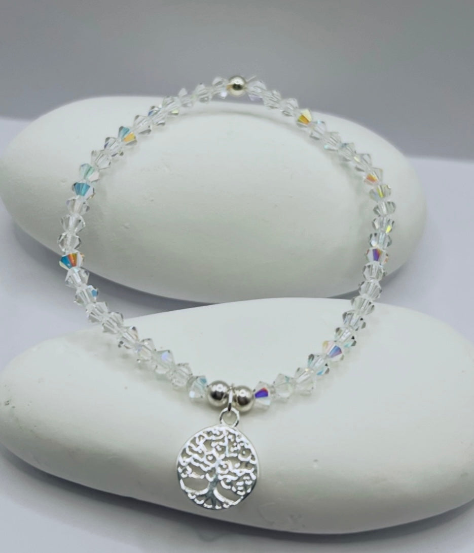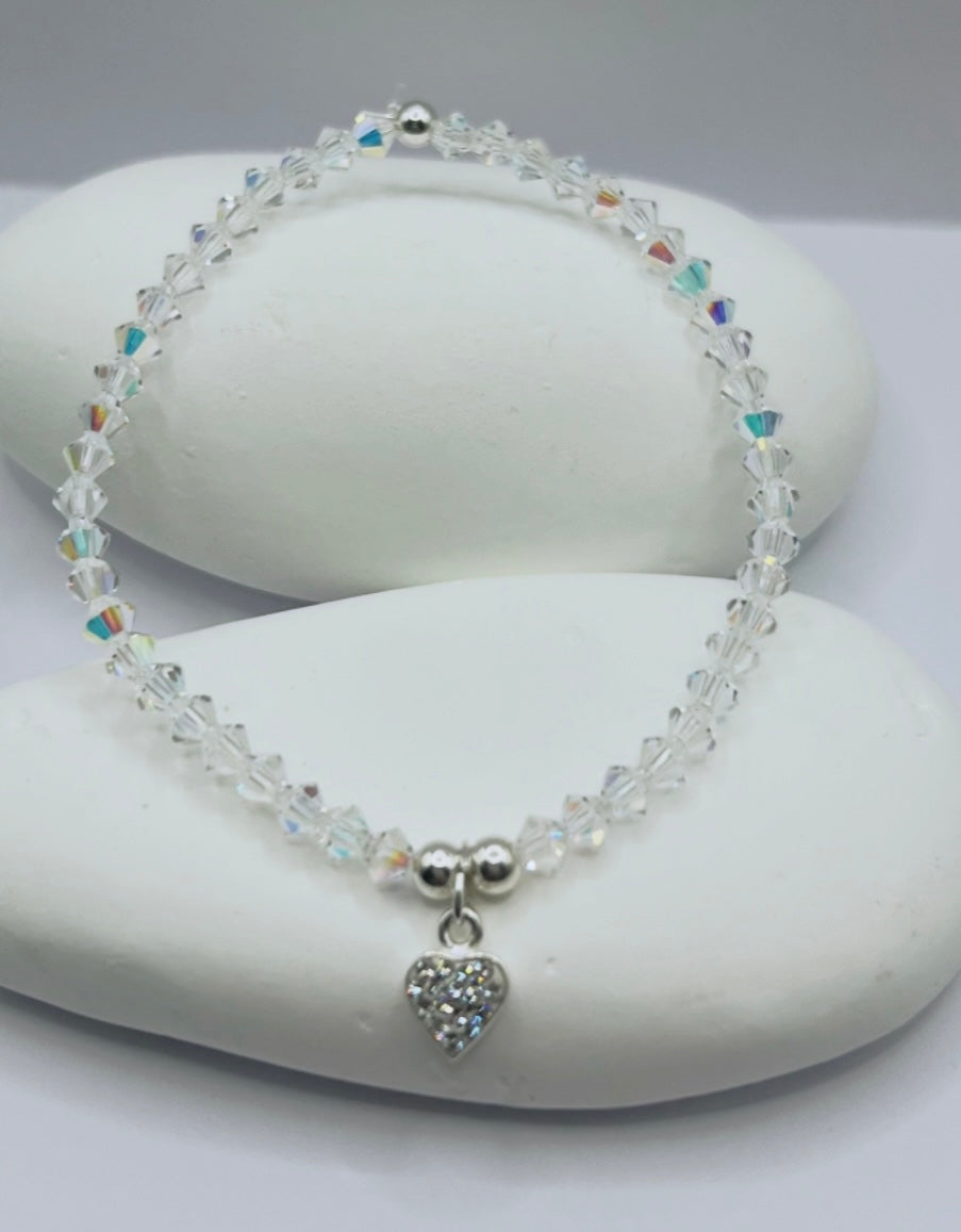bracelet is made with 4mm clear AB bicone and 4mm sterling silver beads with choice of charm